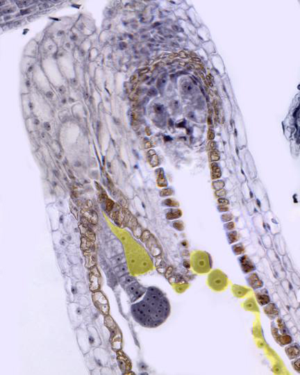 Aspect of a seminal rudiment observed with the objective of 40x. We can perceive the integuments and the nucellus around the embryo sac. Inside embryo sac we can see remains of endosperm (yellow) and the embryo at early development stage. The embryo is united to the suspender, formed by a column of cells. At the end of the suspender is located a large basal cell. Laterally to the embryo are observed the antipodals cells