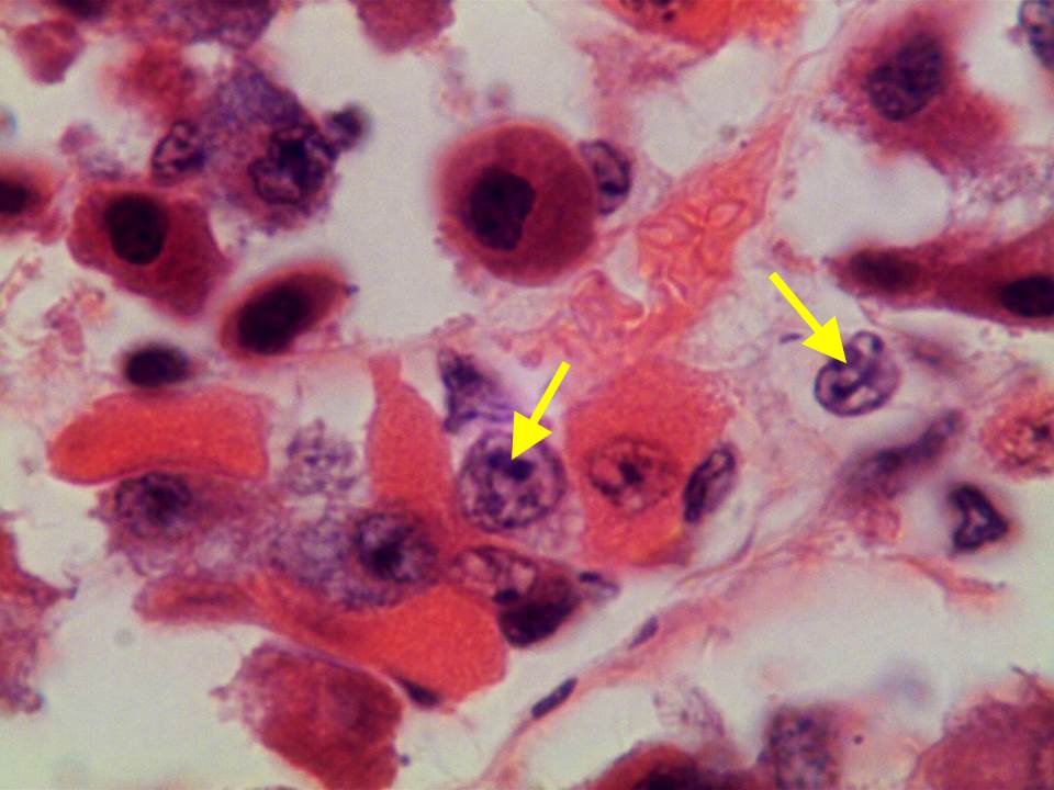 por la hematoxilina y las cromófobas (flechas amarillas) con