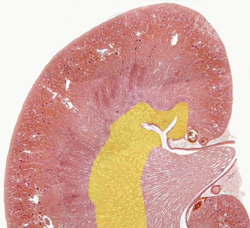 Aspecto de una sección longitudinal del riñón, teñida con hematoxilina/eosina y observada con el objetivo de 4x. A este reducido aumento se observan la corteza y la médula, distinguiéndose en esta última sus dos zonas externa e interna (amarillo). Es visible igualmente la pirámide renal, cuyo extremo o papila está rodeado por el cáliz, en torno al cual se encuentra el seno renal y vasos sanguíneos |
